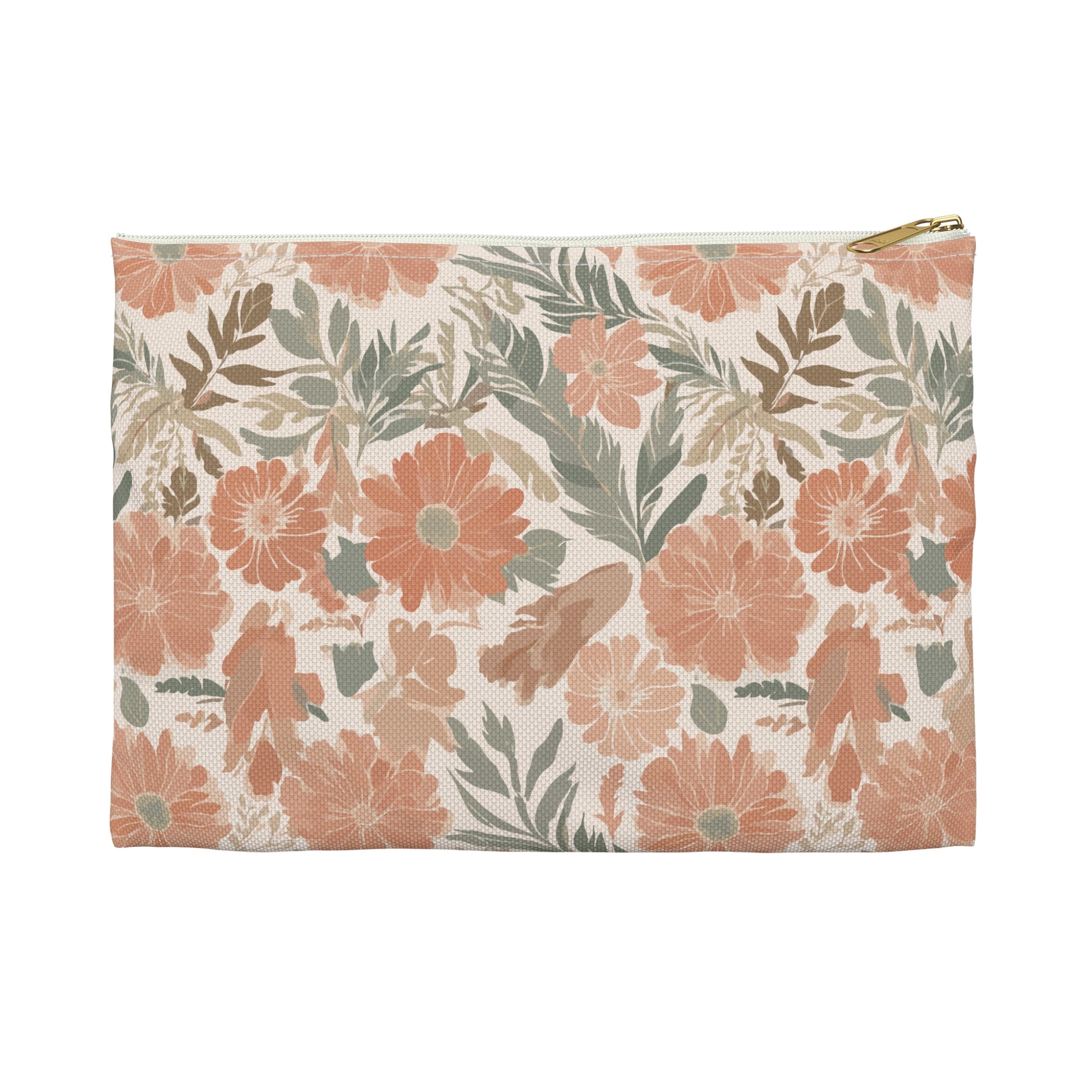 Carry a little piece of painted garden beauty wherever you go with this floral zipper accessory pouch. The design features soft, hand-rendered blossoms in warm peach tones with layered sage and earthy green leaves, creating a calming botanical look that feels artistic and expressive.