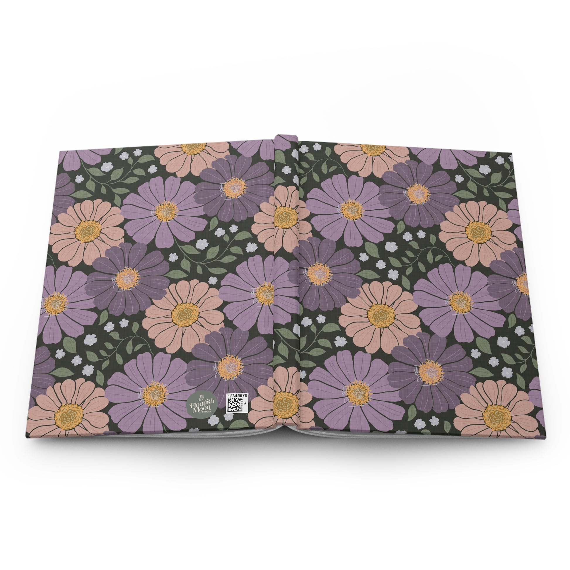 This hardcover journal wraps your thoughts in a soft-matte floral cover that feels calm to the touch and stands up to daily use. Inside, 150 lined pages sit on a sewn spine so the book opens flat and stays flexible as you write, sketch, or plan. Perforated sheets let you tear out pages cleanly when you want to share a note or pin a sketch to a board. The full wraparound print keeps the hand-drawn daisies flowing across front and back, while vivid printing keeps the purple and blush tones rich against the deep background. Small production details like the subtle barcode on the back don’t distract from the design’s quiet, vintage-inspired charm.